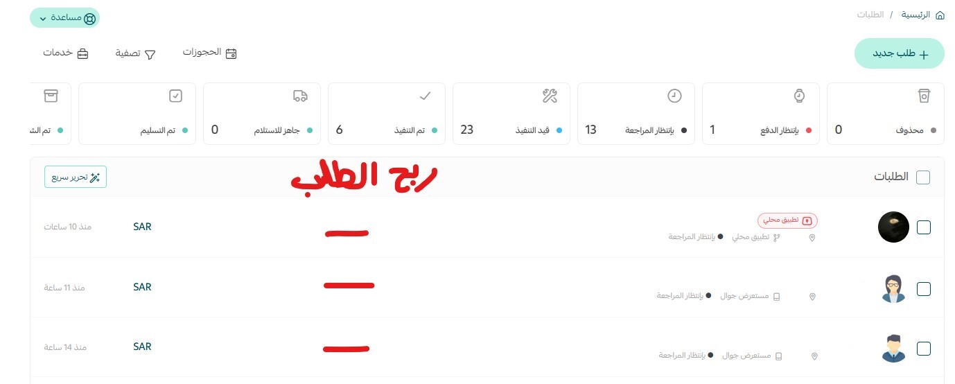 2. في قائمة الطلبات يظهر كعمود ربح الطلب