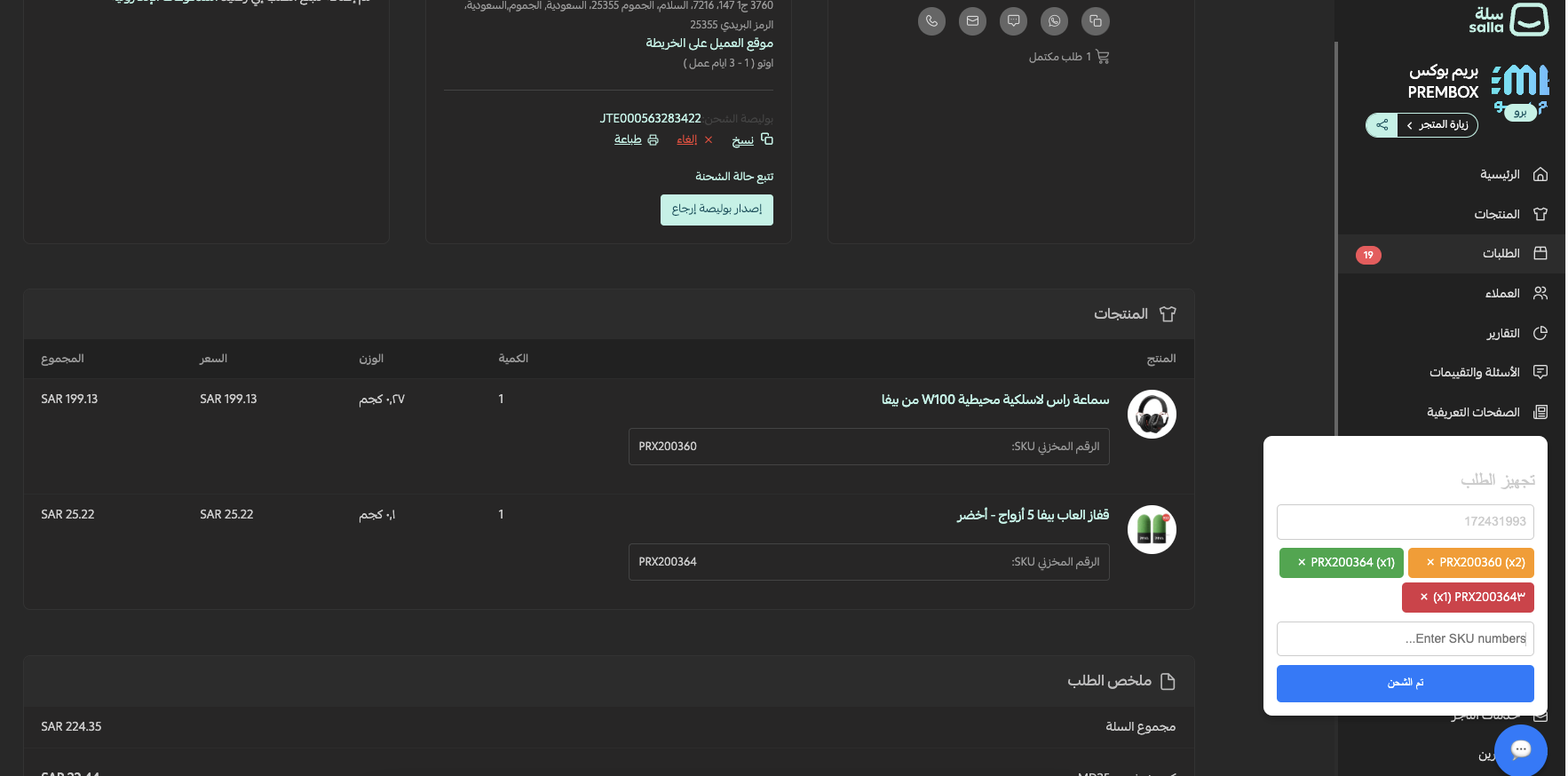 بعد ذلك عند الضغط على زر تم الشحن يتم اضافة ارقام الsku في كومنت الطلب + تحديث حالة الطلب تم الشحن