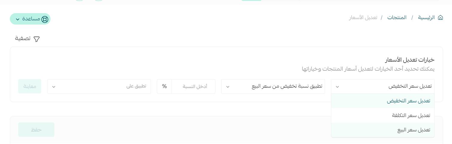 يمكنك عمل ذلك من خلال التوجه لصفحة المنتجات ومن ثم النقر على خيار " خدمات " واختيار خيار " تعديل الاسعار " ستتمكن من خلال صفحة تعديل الاسعار تعديل سعر التخفيض على جميع المنتجات كما هو موضح في الصورة المرفقه :