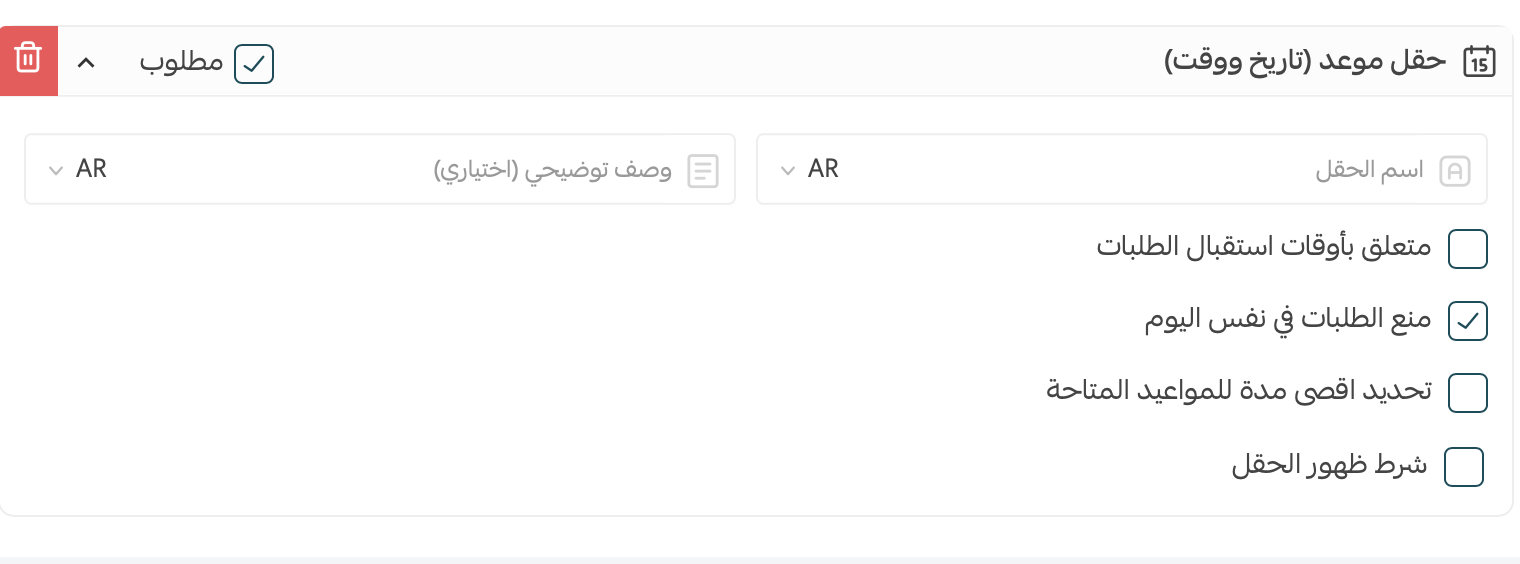 يمكنك عمل ذلك من خلال اضافة المنتج من نوع " خدمة حسب الطلب " ومن ثم النقر على بيانات المنتج اختر نموذج الطلب وقم باضافة خيار من نوع " حقل موعد (تاريخ ووقت) " ويمكنك منع الطلب في نفس اليوم كما هو موضح في الصورة المرفقه :