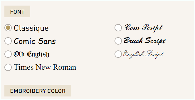 Dear, Please we need to have the service and the option where the client choose the font and the color of the embroidery