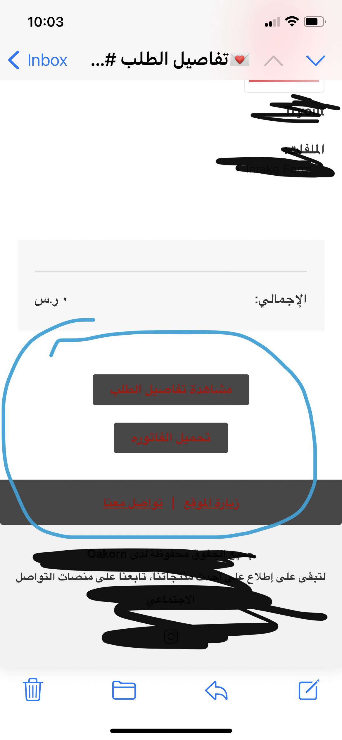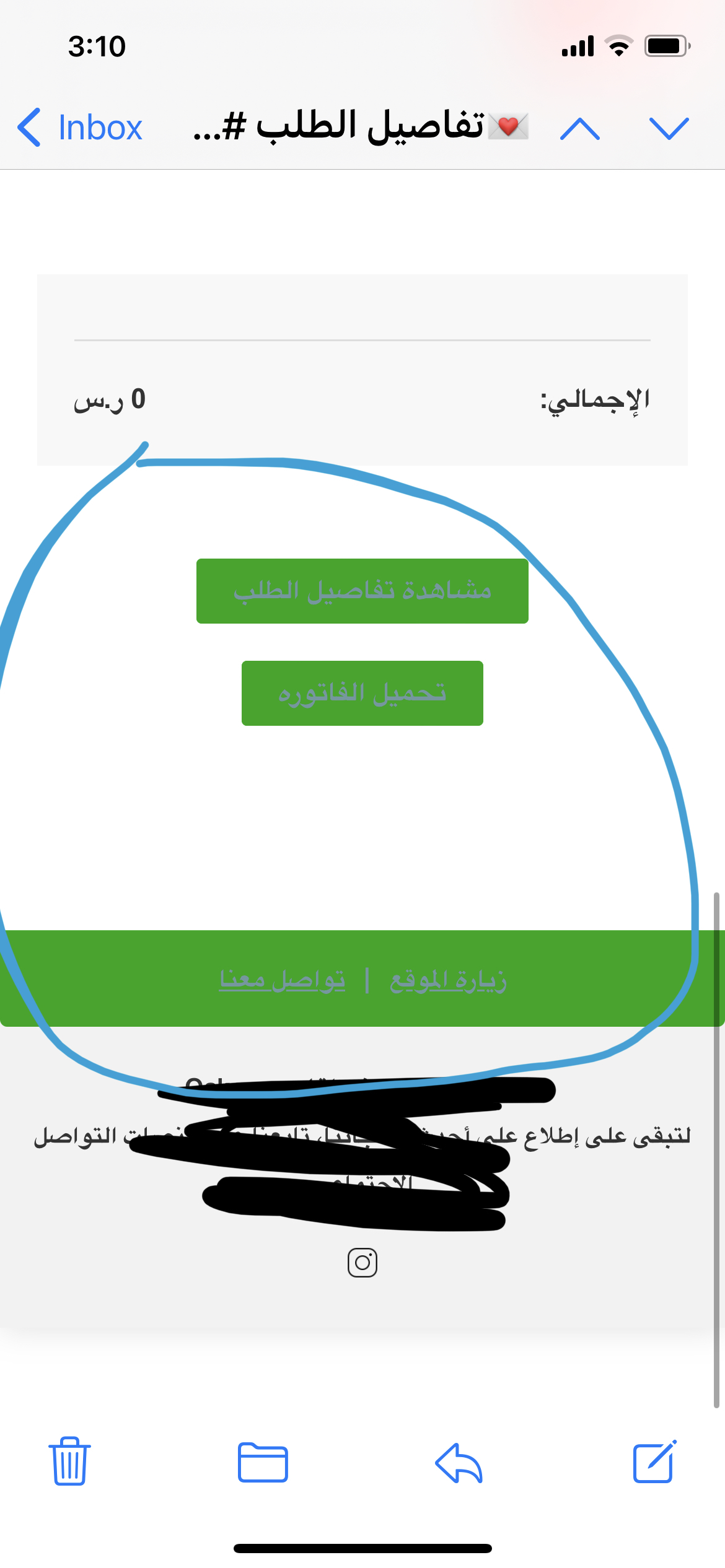 ذيل الفاتورة (مشاهدة تفاصيل الطلب، تحميل الفاتورة، زيارة الموقع، تواصل معنا) تتغير ألوانها بطريقة عشوائية غير متماشية مع ألوان المتجر وبعضها يصعب قراءتها وبذلك غير عملية.